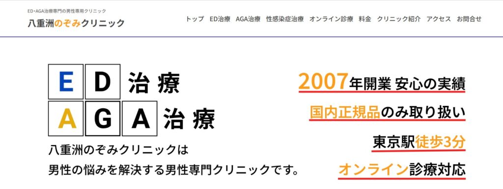 八重洲のぞみクリニックはEDやAGAなど、男性の悩みに特化して診療しているクリニックです。